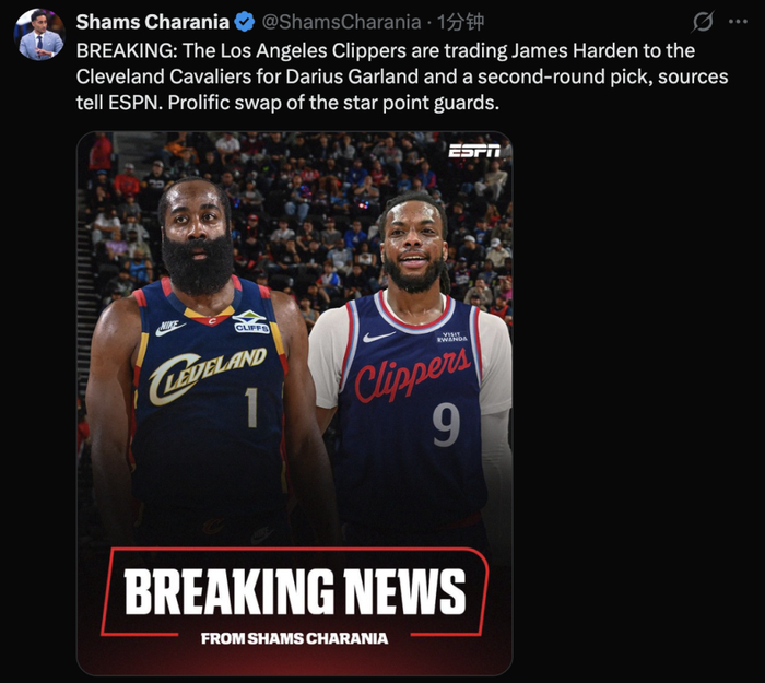 据名记Shams报道,快船将哈登交易至骑士,换来加兰和一个次轮选秀权,两位明星控卫的互换可谓意义重大。哈登联手米切尔将会提升骑士上限,继续冲击总冠军。