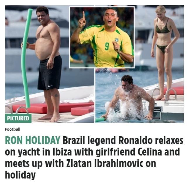 据《太阳报》报道,近日巴西传奇球星罗纳尔多被拍到与女友赛琳娜在伊比萨岛度假。图片中的大罗身材走形严重,但依然无碍他享受假期的快乐。罗纳尔多曾表示自己患有甲状腺功能减退症的病,新陈代谢变得缓慢,无法控制自己的体重。巧的是,罗纳尔多在伊比萨还偶遇了也在此度假的伊布,瑞典人在社交媒体上还上传了与大罗的合照。